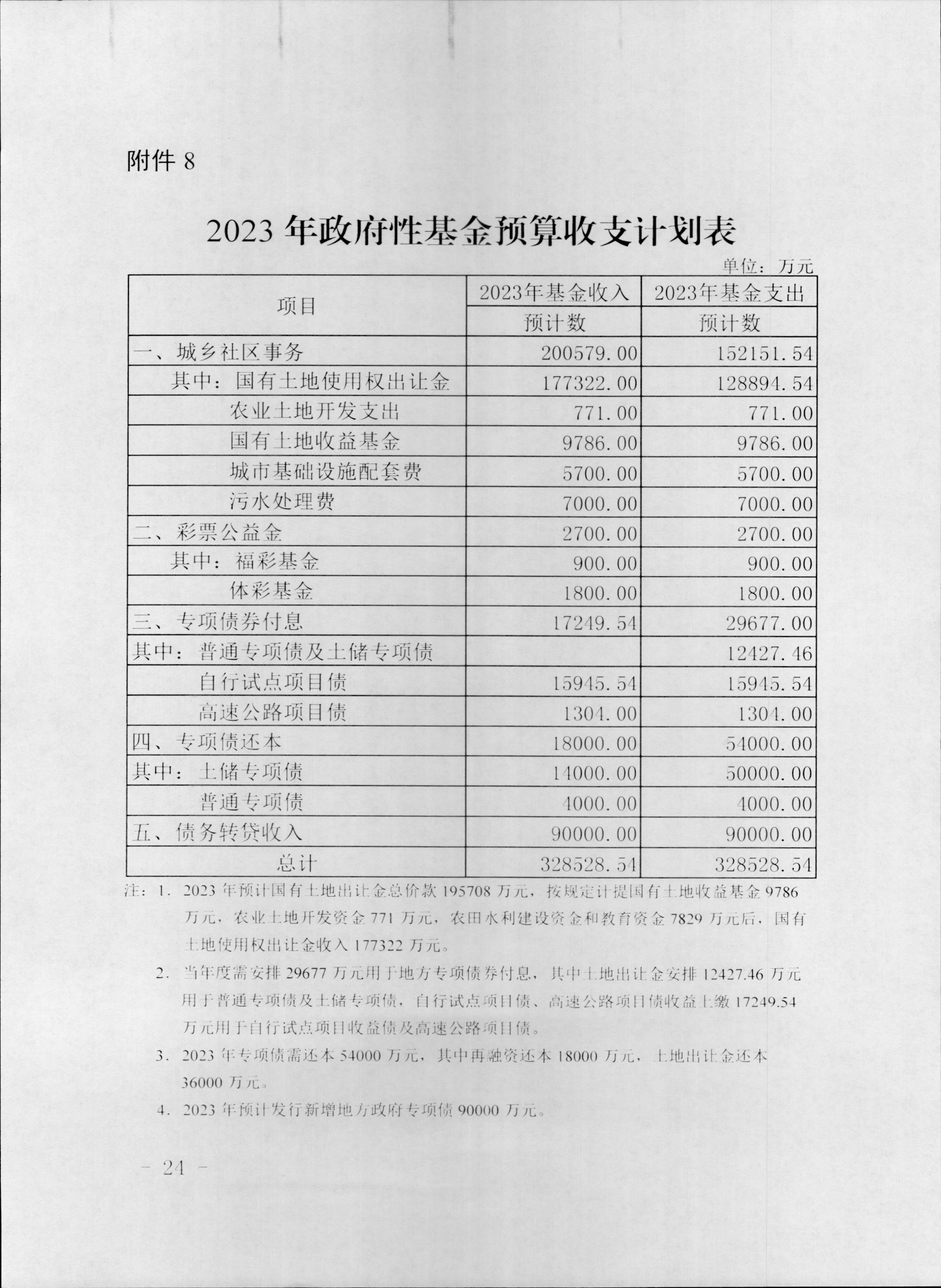 政府性基金收入32.85億元,其中國有土地使用權出讓金收入17.73億元,專項債收入初步安排9億元;政府性基金支出32.85億元,實現收支平衡。2023年我市申報專項債項目22個、資金需求90.46億元,項目資金需求待中央、省級額度批復后,再根據進度報市人大常委會進行預算調整。