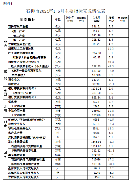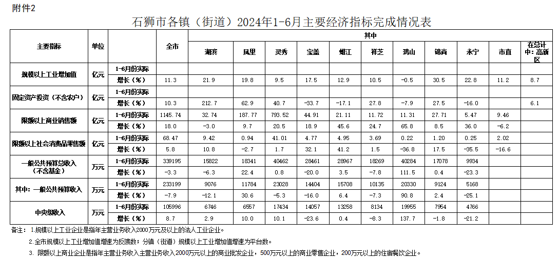 2.石獅市各鎮(街道)2024年1-6月主要經濟指標完成情況表