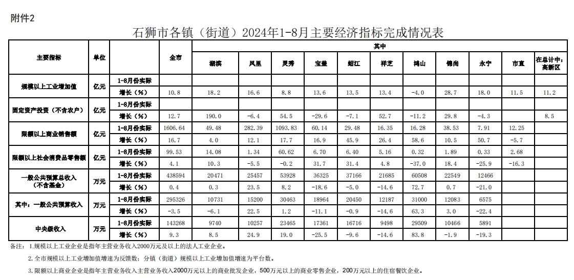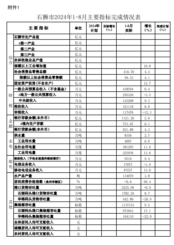 石獅市2024年1-8月主要指標完成情況及各鎮(街道)主要指標完成情況表