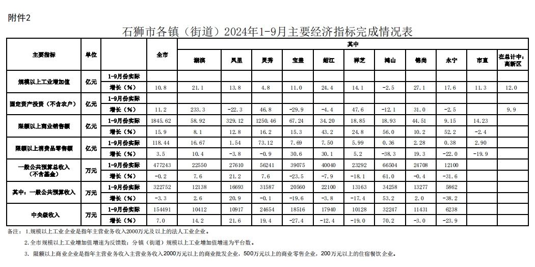 2.石獅市各鎮(街道)2024年1-9月主要經濟指標完成情況表